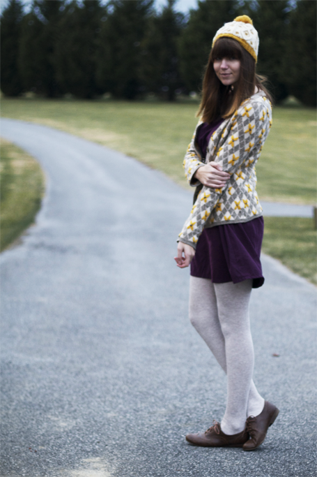 Super cute outfit! the grey and yellow in the sweater compliment the purple dress. I've totally been raiding Modcloth too. As soon as they posted that they were having a sale, I hit that up!